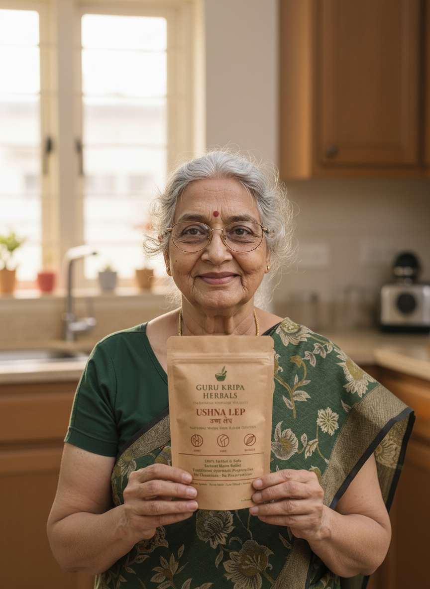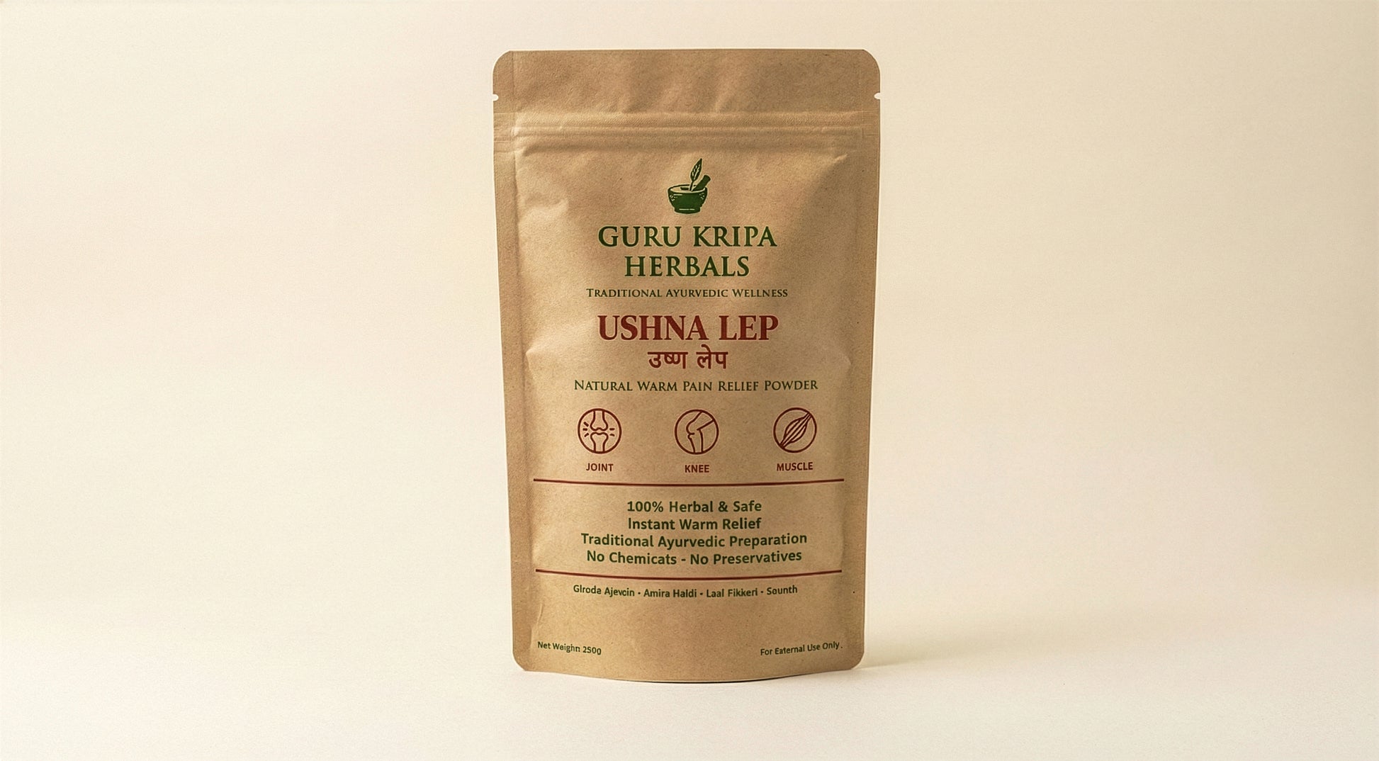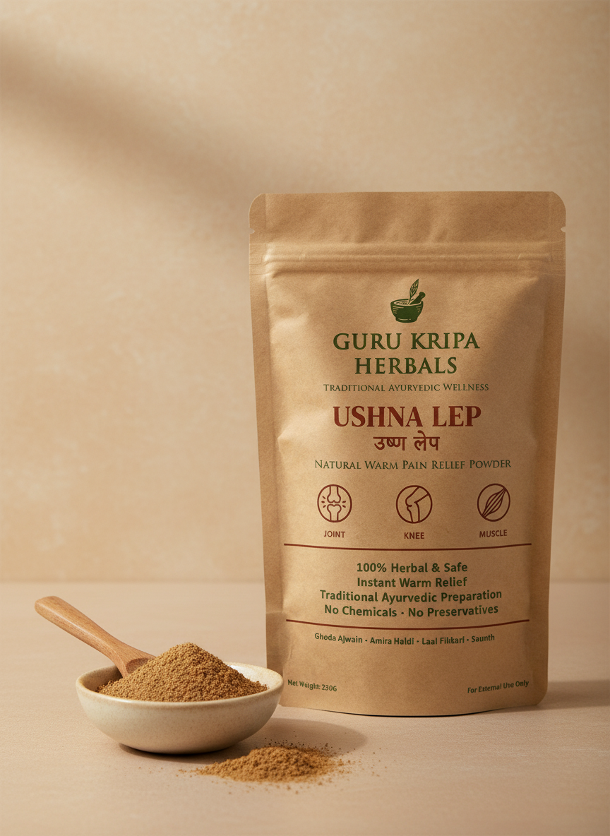 Ushna Lep (उष्ण लेप) is a traditional Ayurvedic warm herbal preparation in powder form, designed for external application. Prepared fresh at home with pure sesame oil, it delivers soothing warmth that is traditionally used to support comfort in joints, knees, muscles, and areas affected by stiffness or fatigue.
