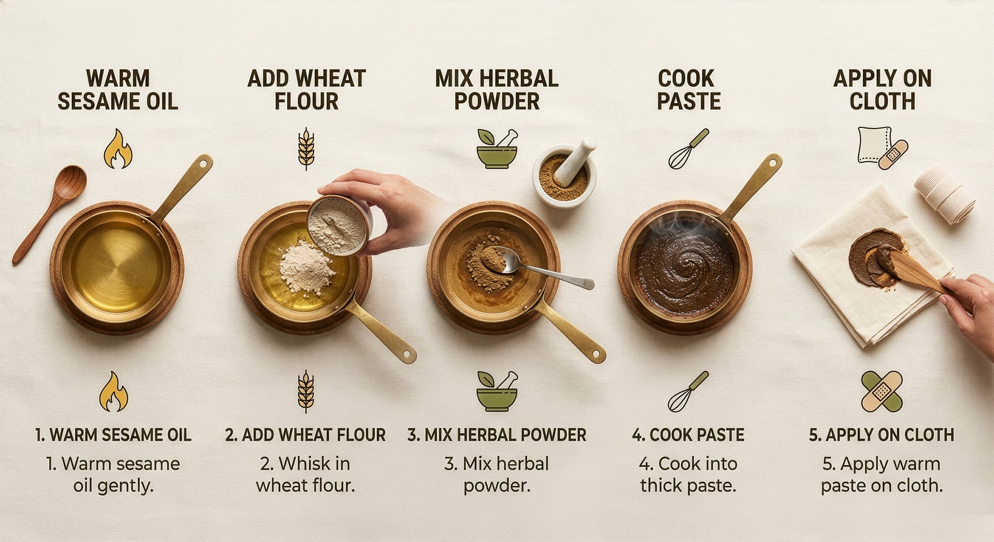 5. Spread warm paste on a clean cloth/roti and place on the affected area.